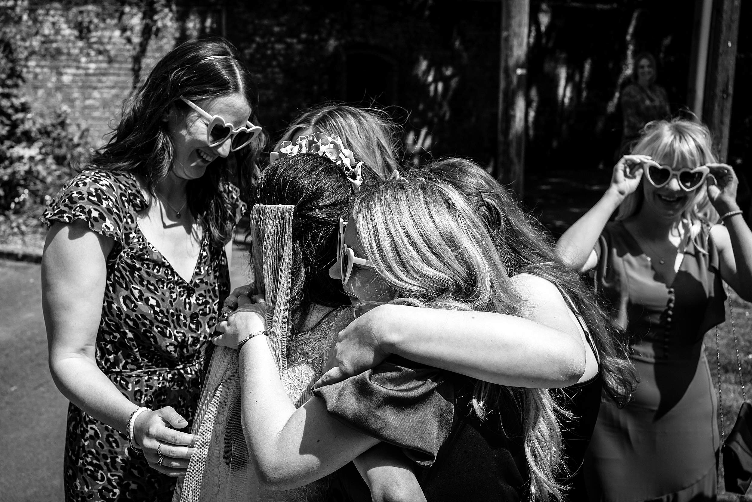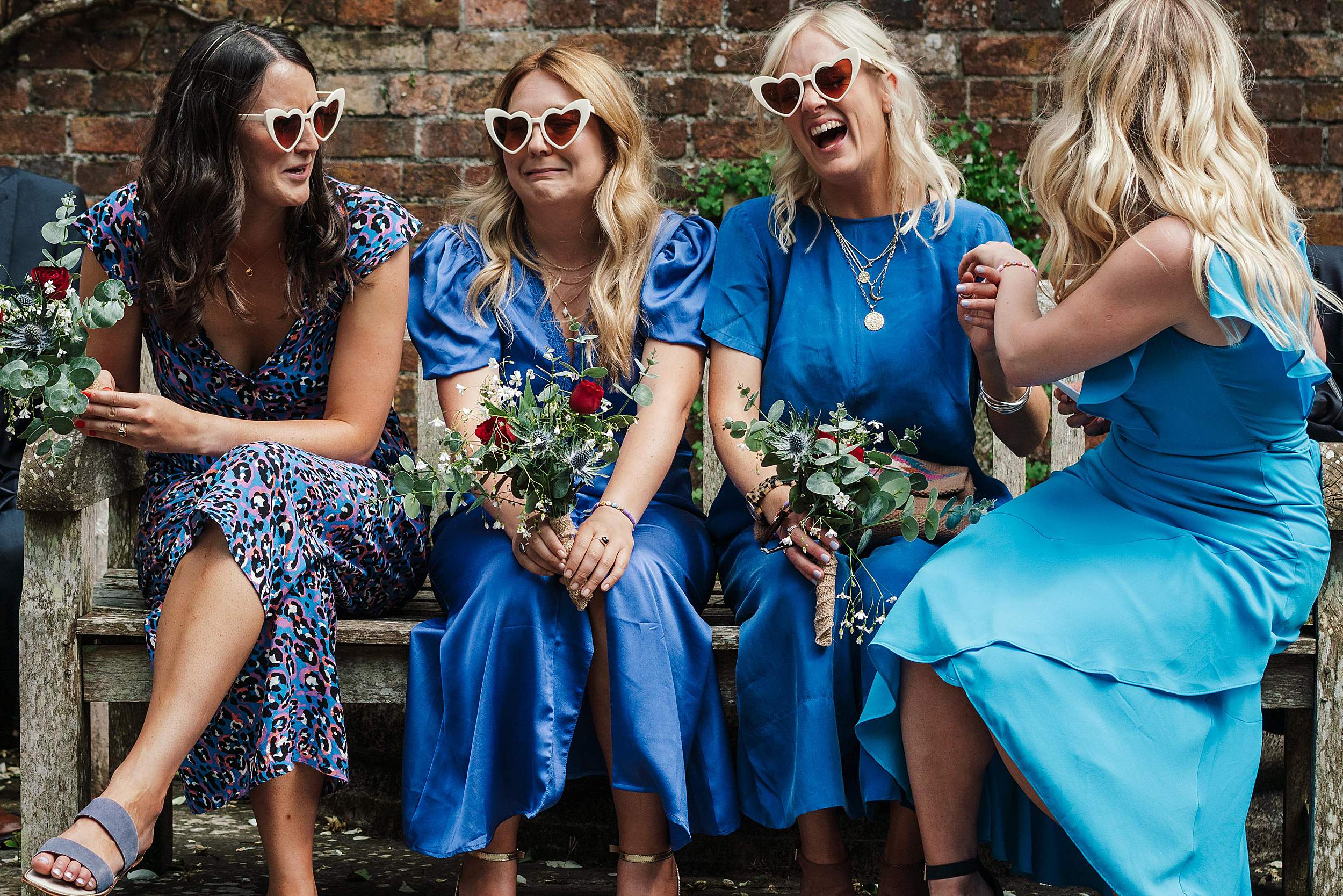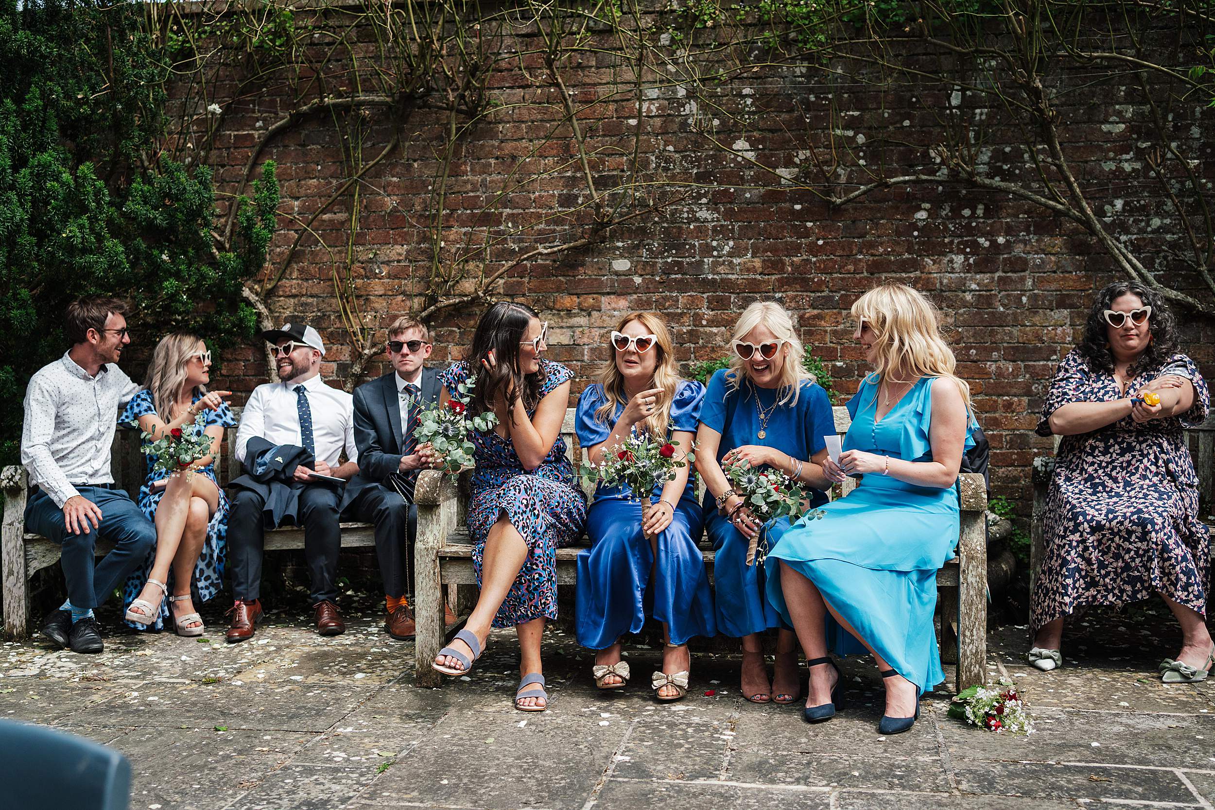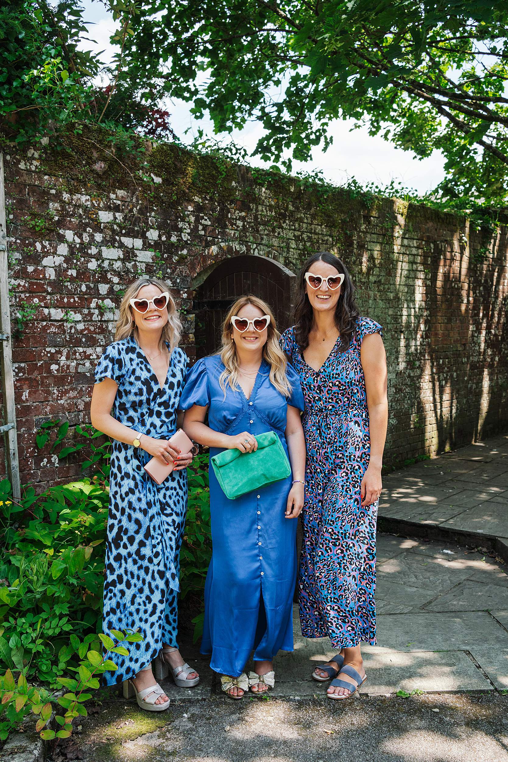 Guests gathered in the walled garden, tucked away from the outside world, sunlight pouring in. Then came one of those details that instantly tells you what the day’s going to be like: the bridesmaids waiting for Fi’s arrival in heart-shaped sunglasses.