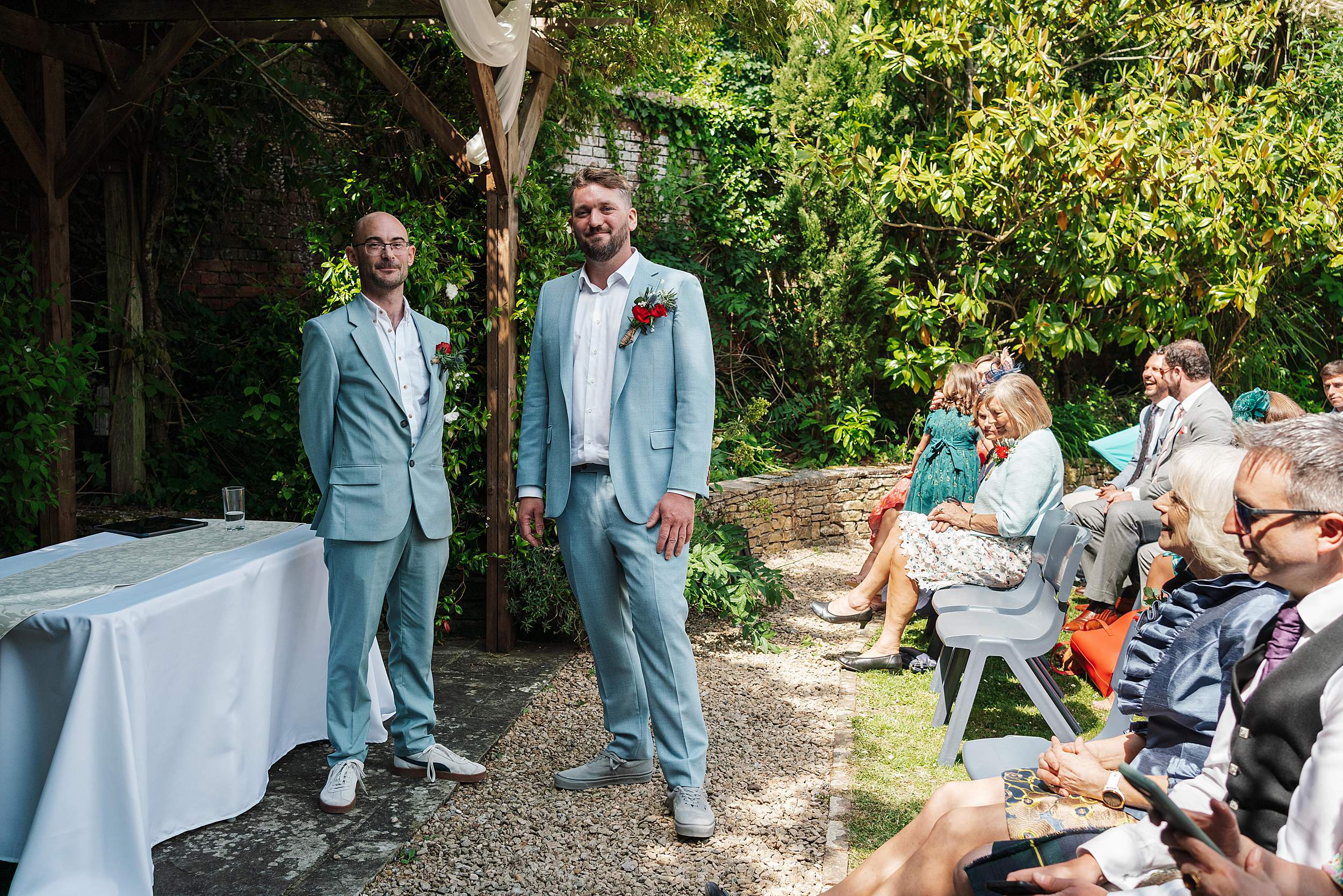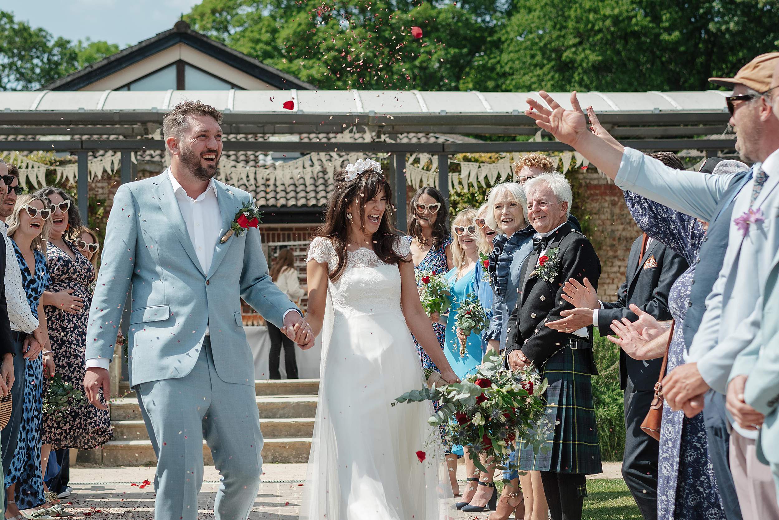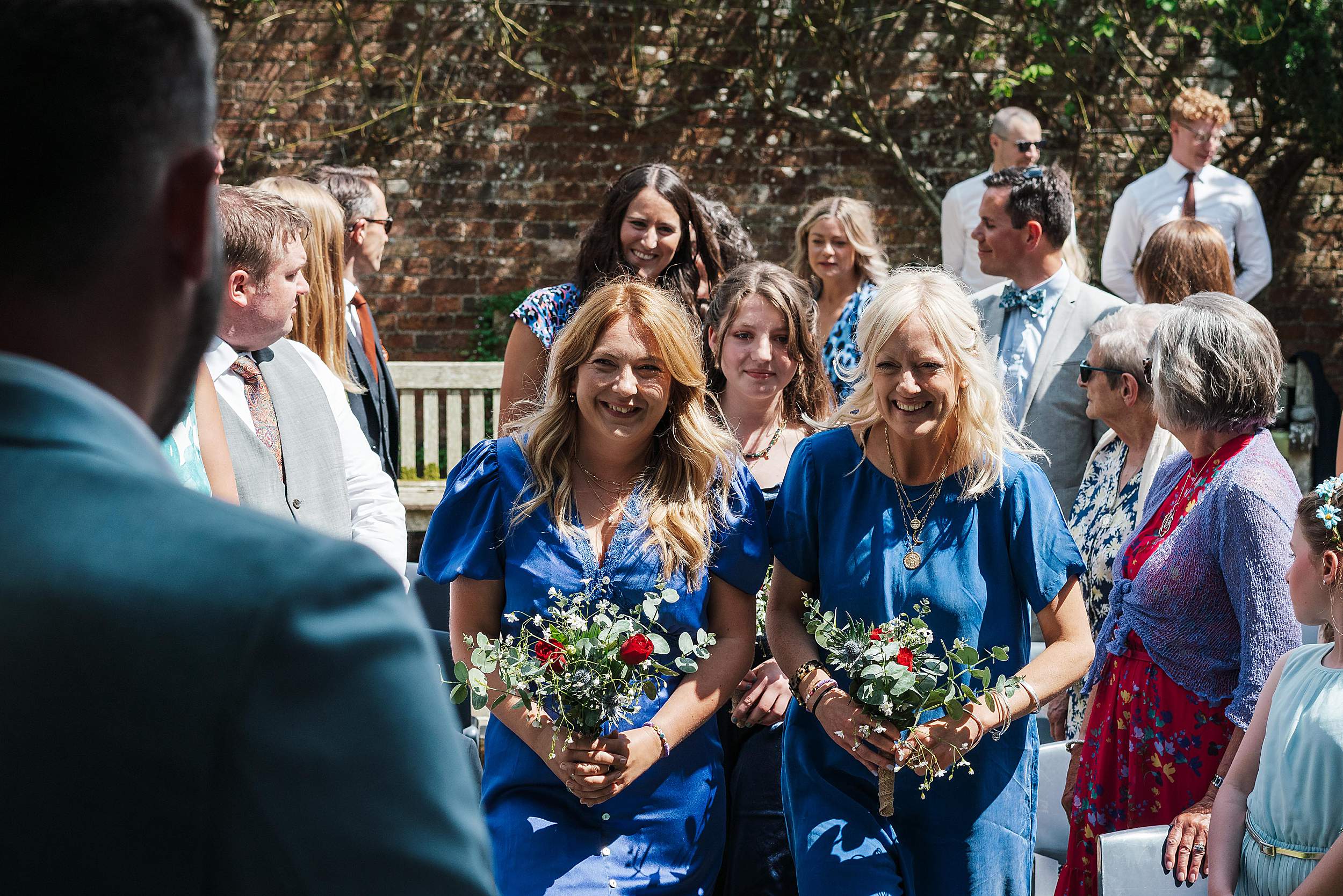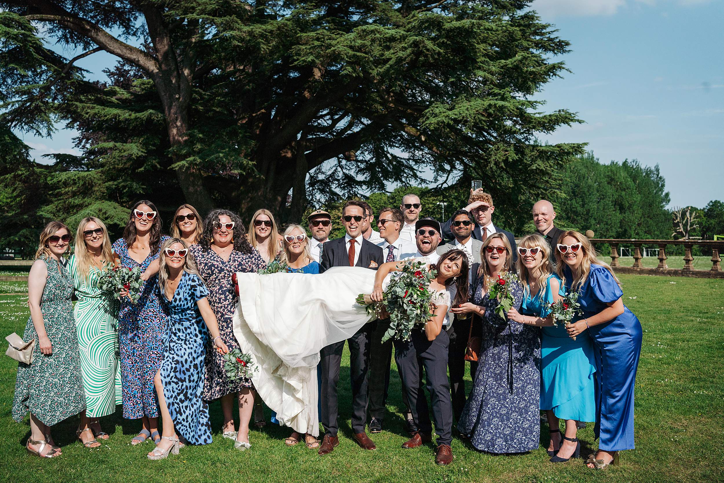 Guests gathered in the walled garden, tucked away from the outside world, sunlight pouring in. Then came one of those details that instantly tells you what the day’s going to be like: the bridesmaids waiting for Fi’s arrival in heart-shaped sunglasses.