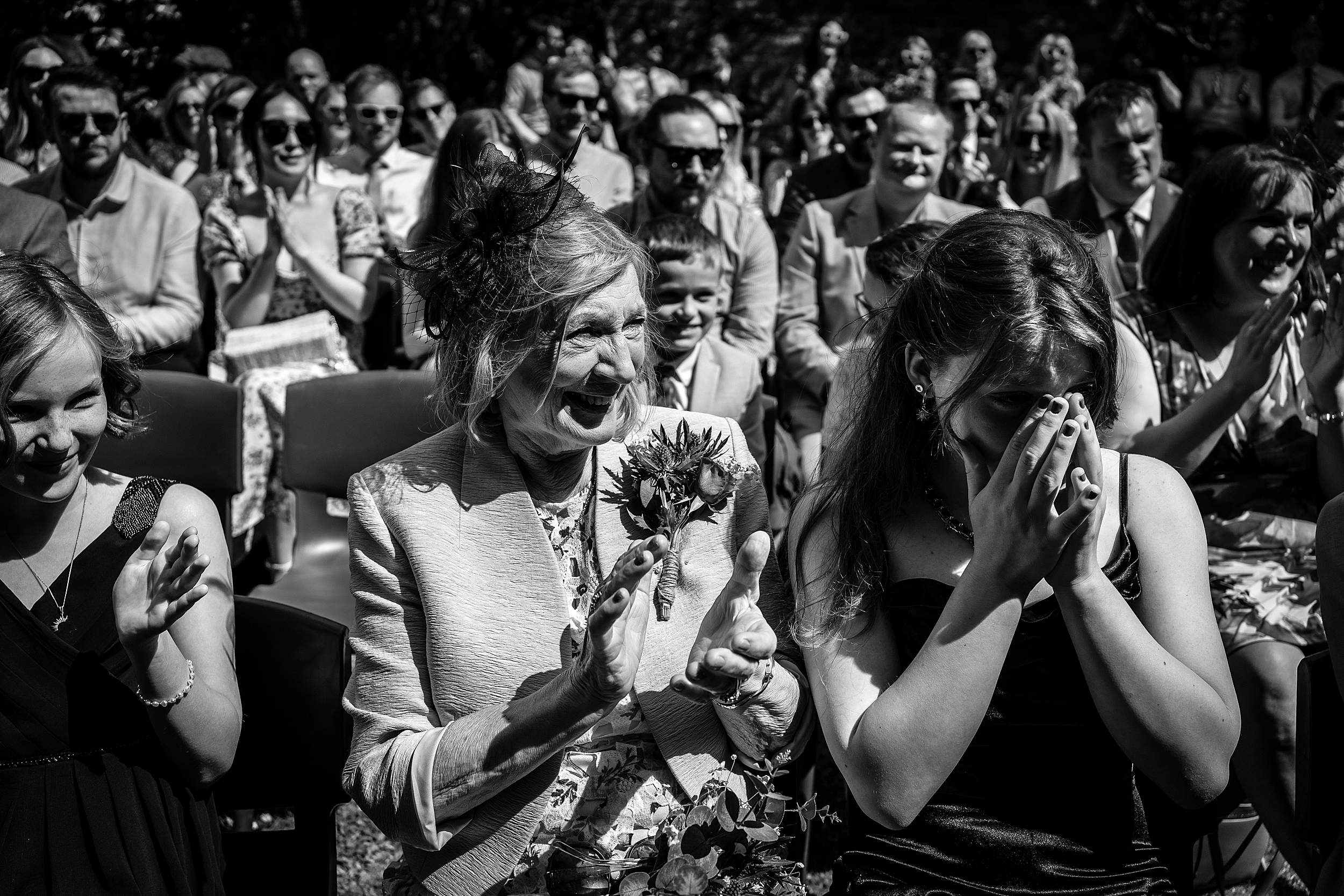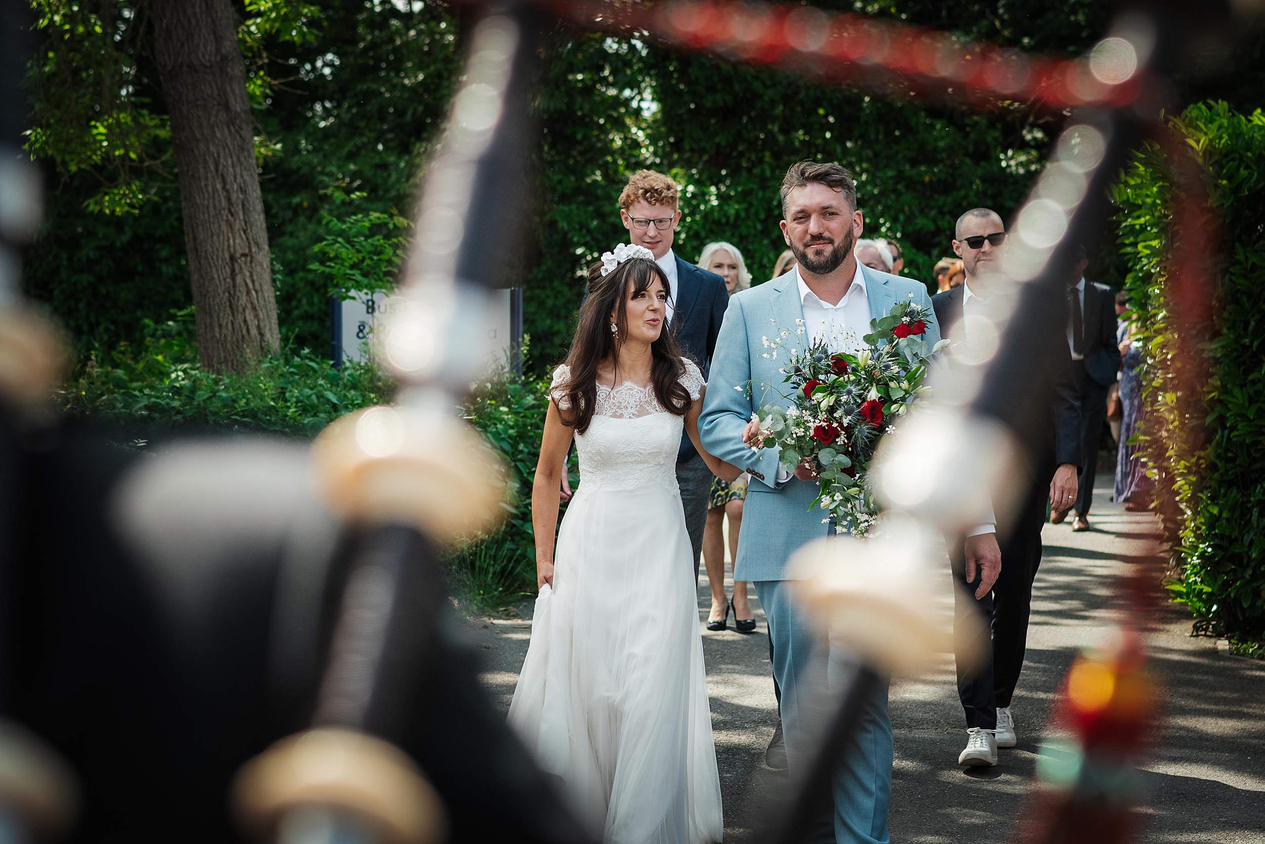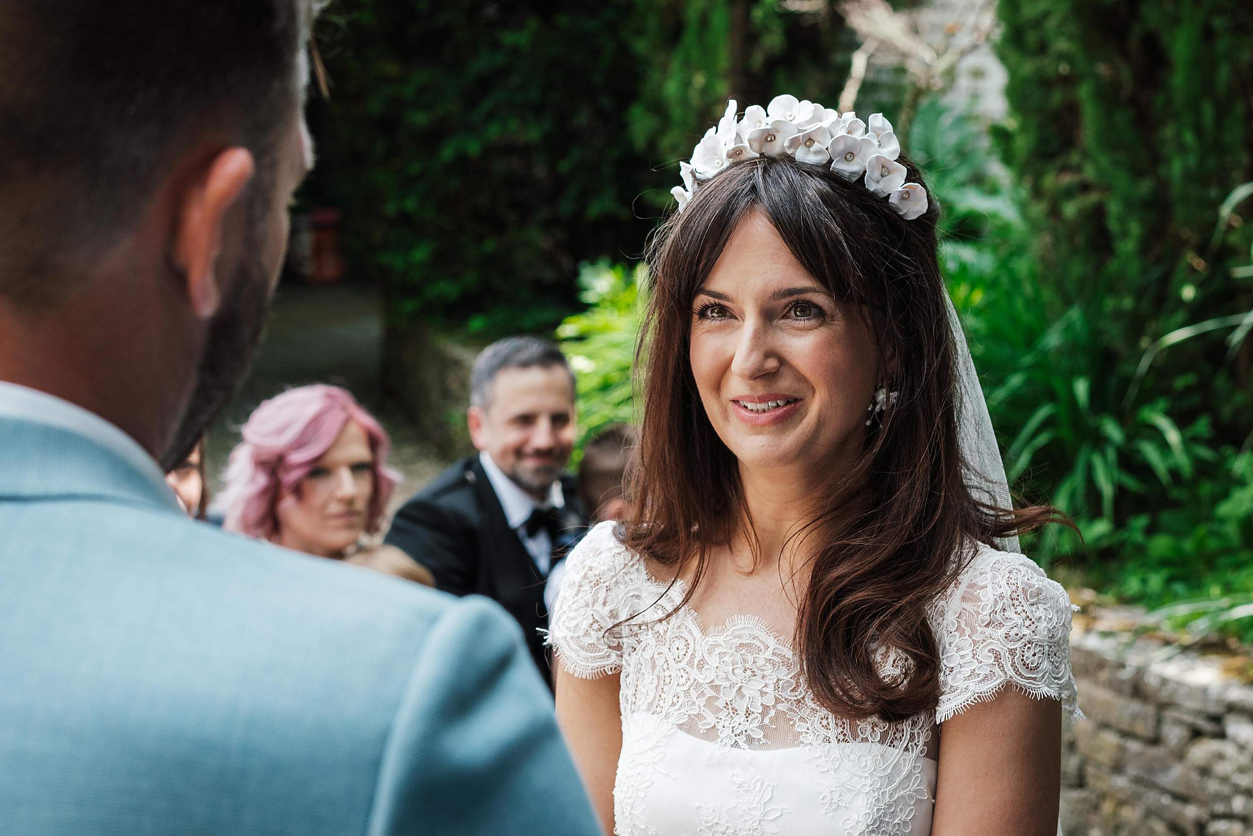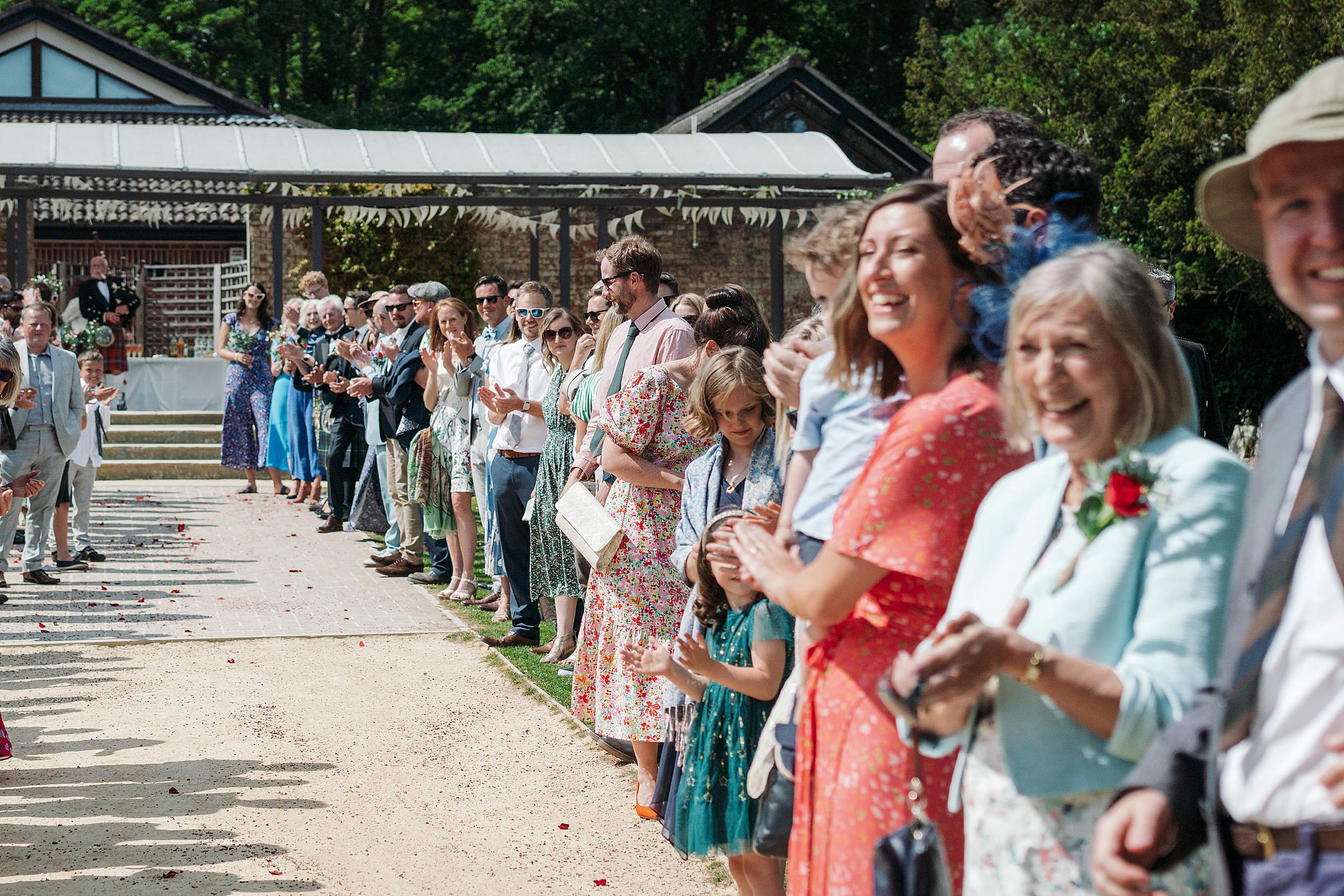 Guests gathered in the walled garden, tucked away from the outside world, sunlight pouring in. Then came one of those details that instantly tells you what the day’s going to be like: the bridesmaids waiting for Fi’s arrival in heart-shaped sunglasses.