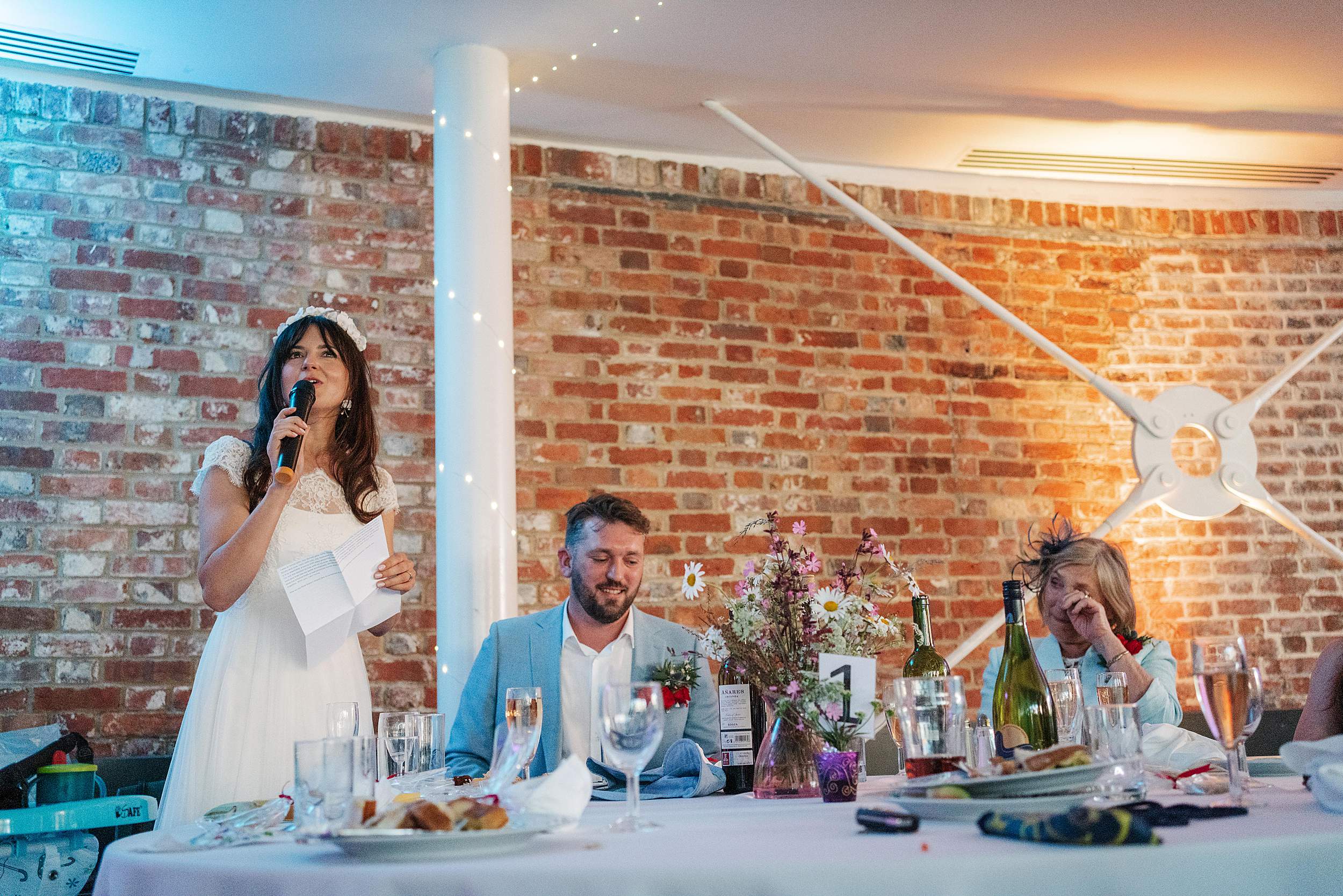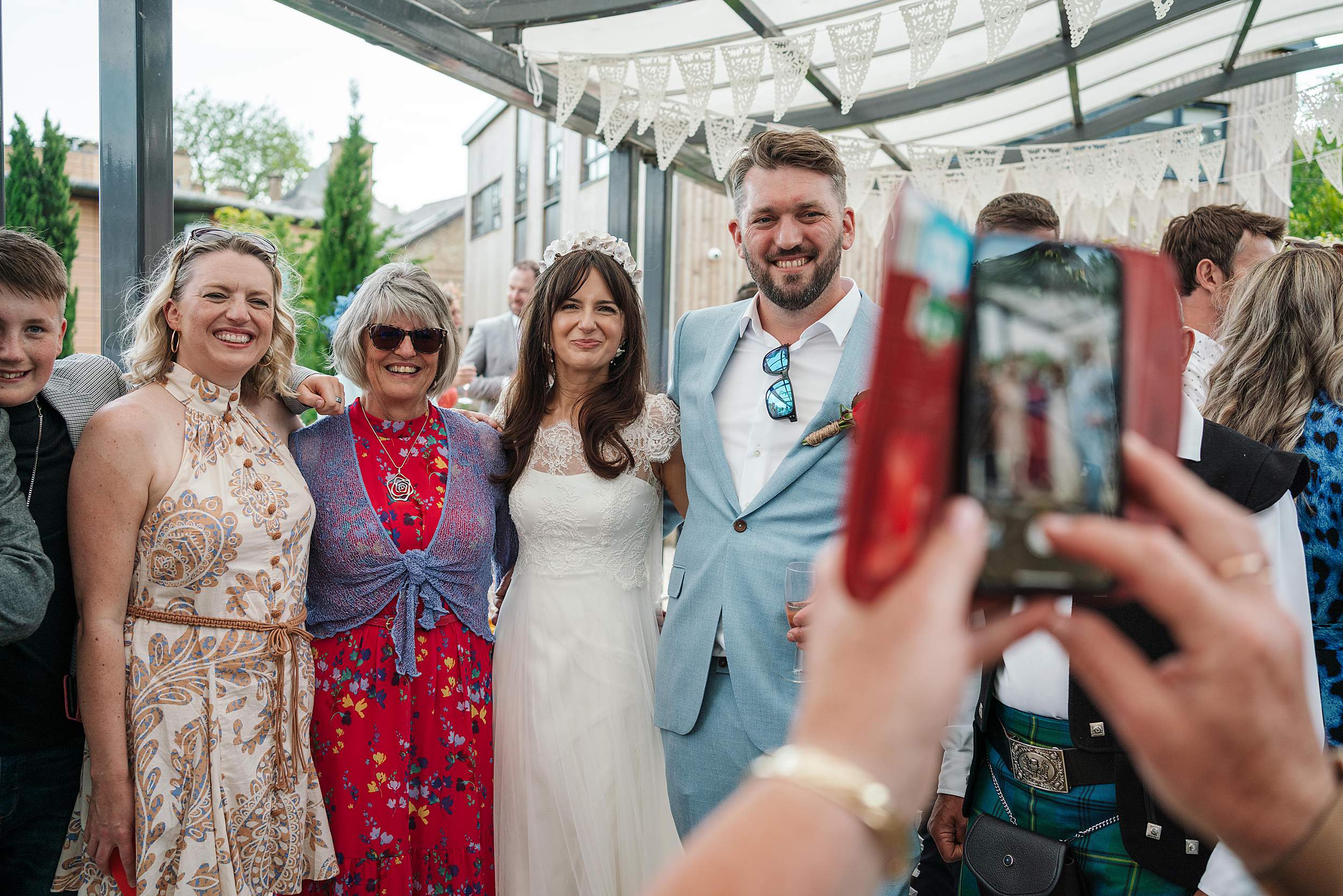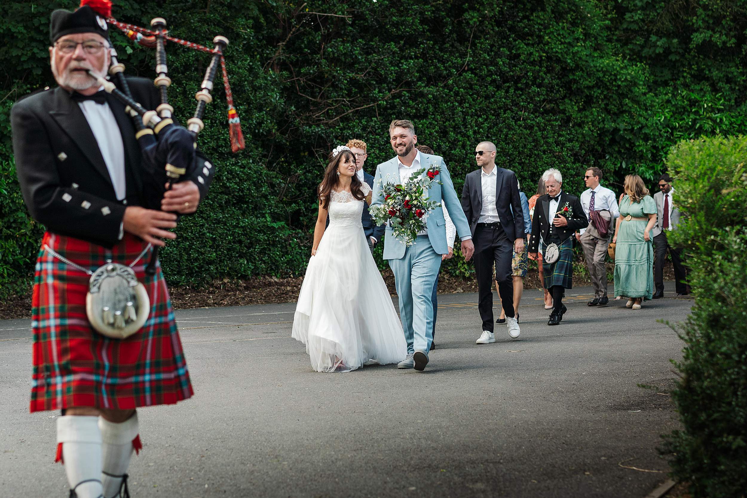 Fi’s uncle is a Scottish piper, and that sound cutting through the air as she arrived was something else – ceremonial, emotional, and a little bit goosebump-inducing. And after the ceremony, he didn’t just play – he escorted the wedding party around the building to the drinks area, turning that short walk into its own moment.
