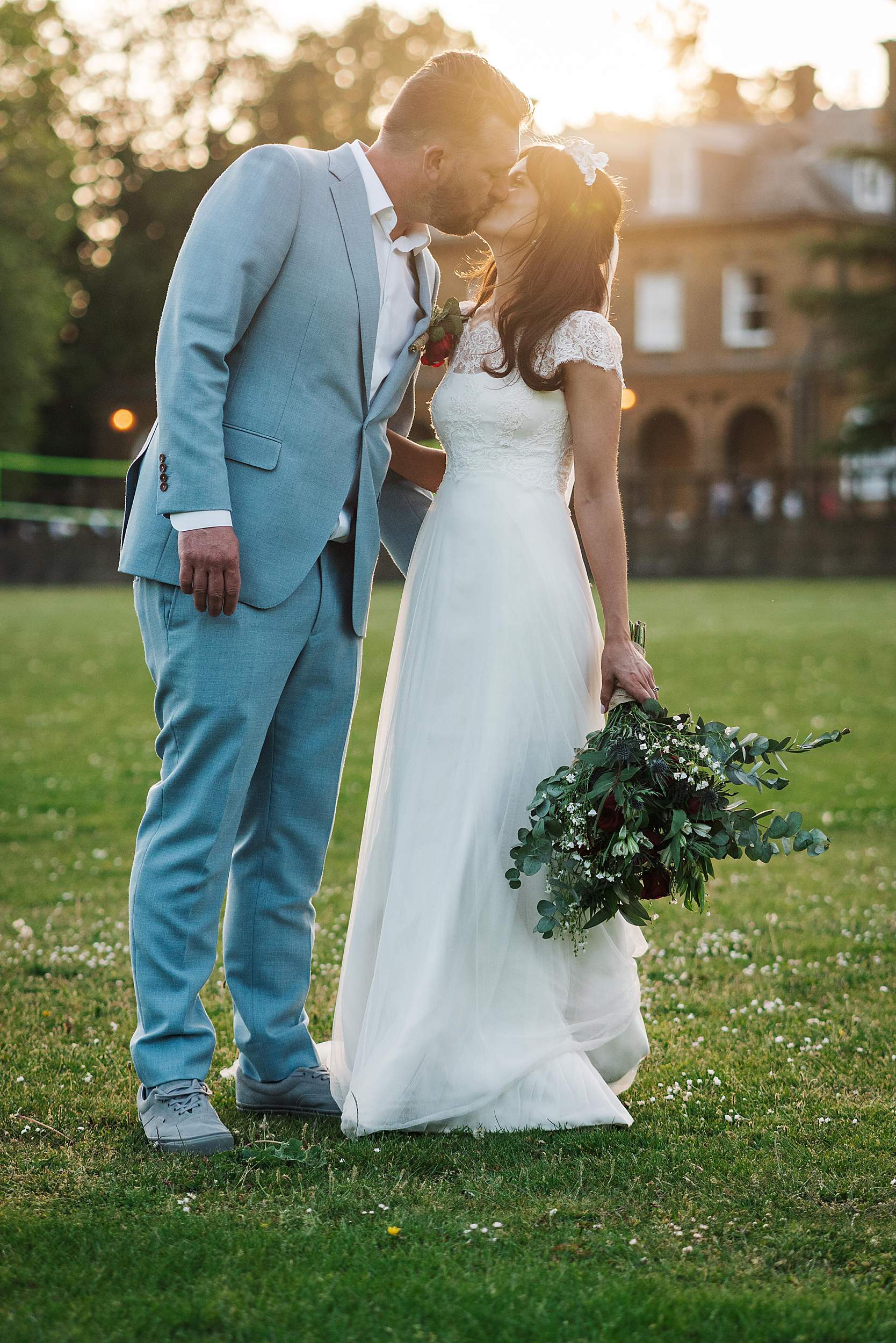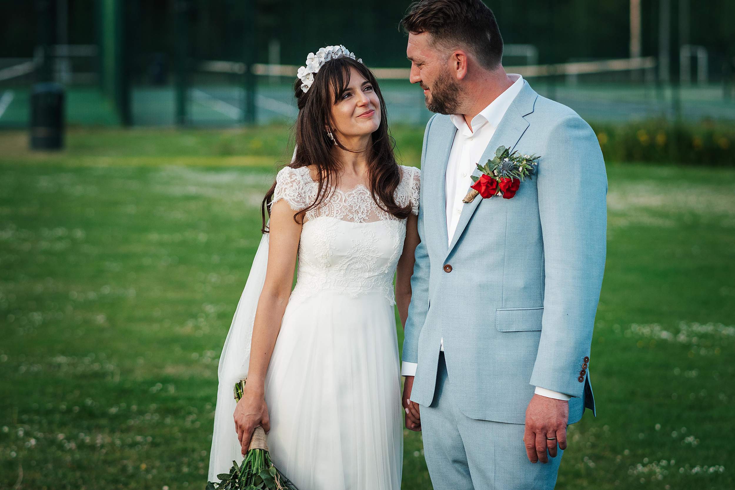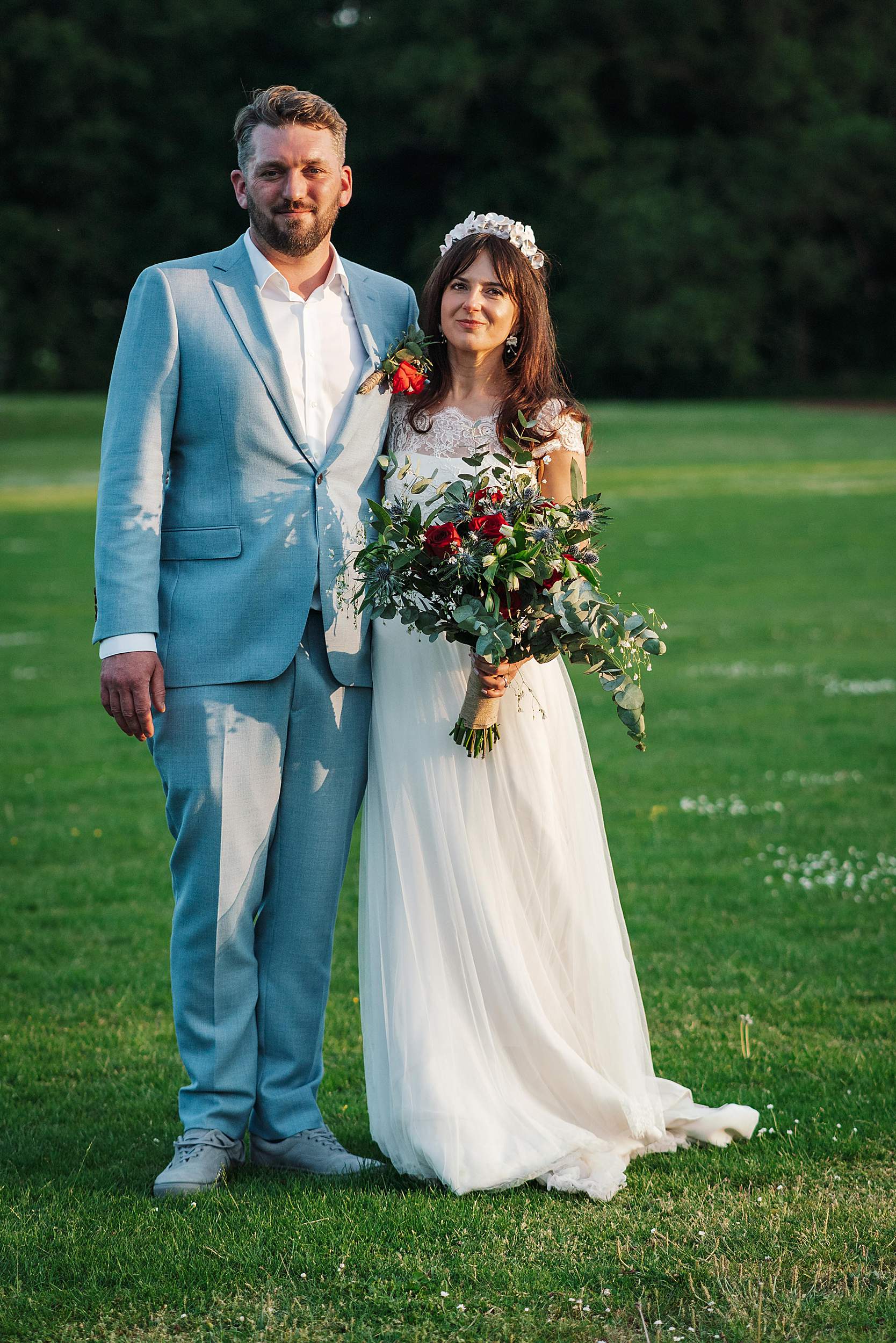 As the light softened, we stole Fi & Tim away for a few gently led portraits out on the school playing fields. Nothing heavy, nothing staged – just a short breather and some space to be together, with golden hour doing what golden hour does best.