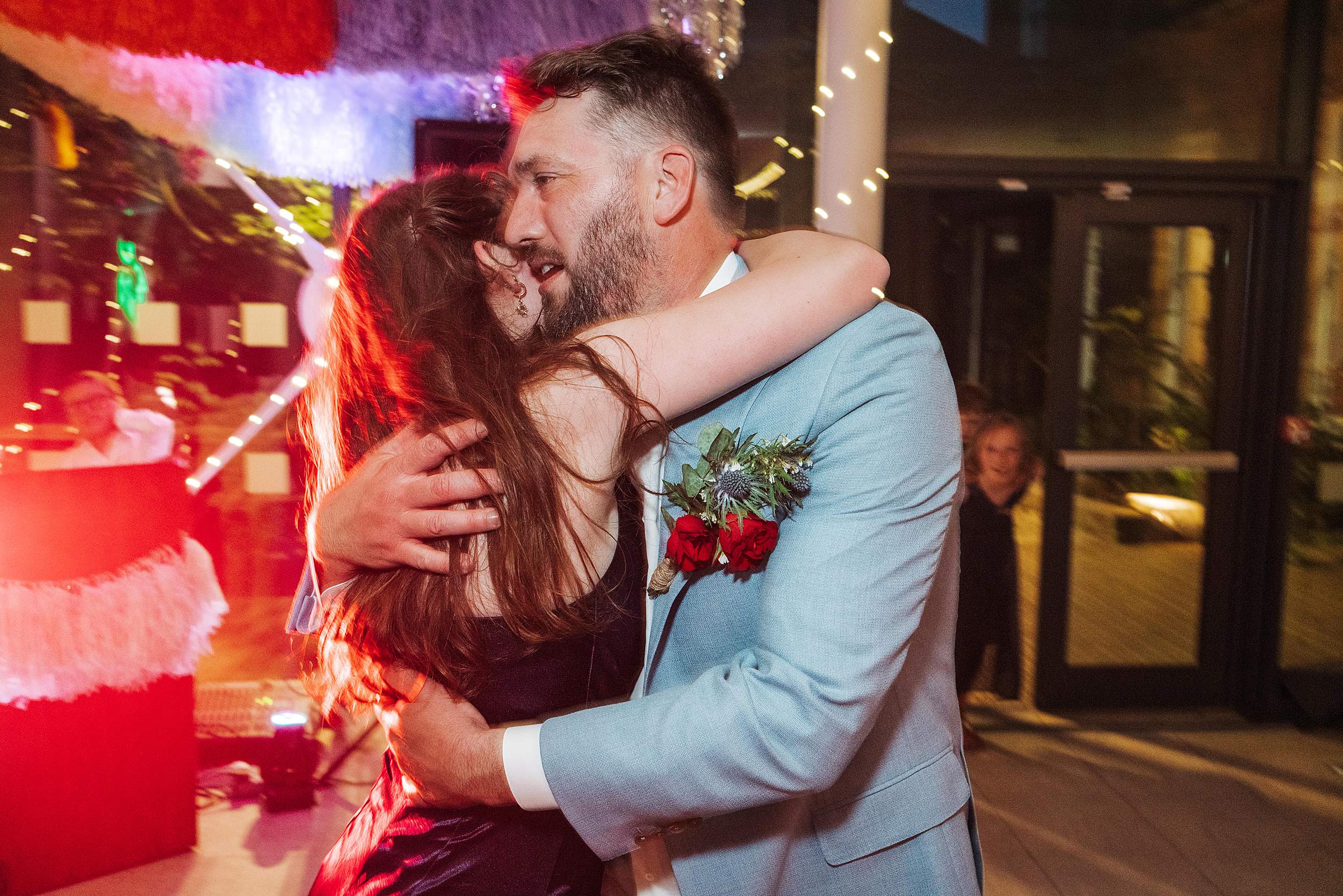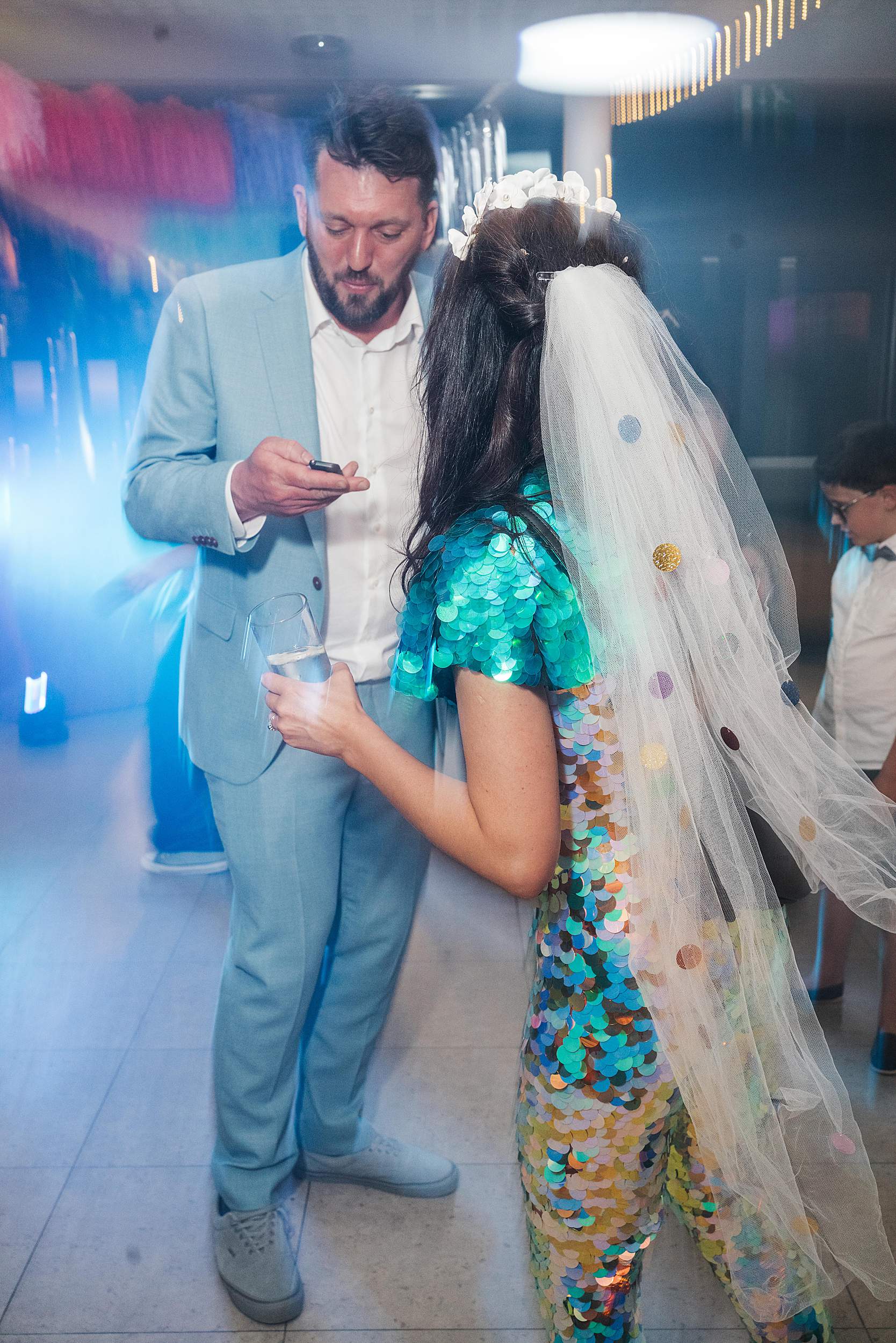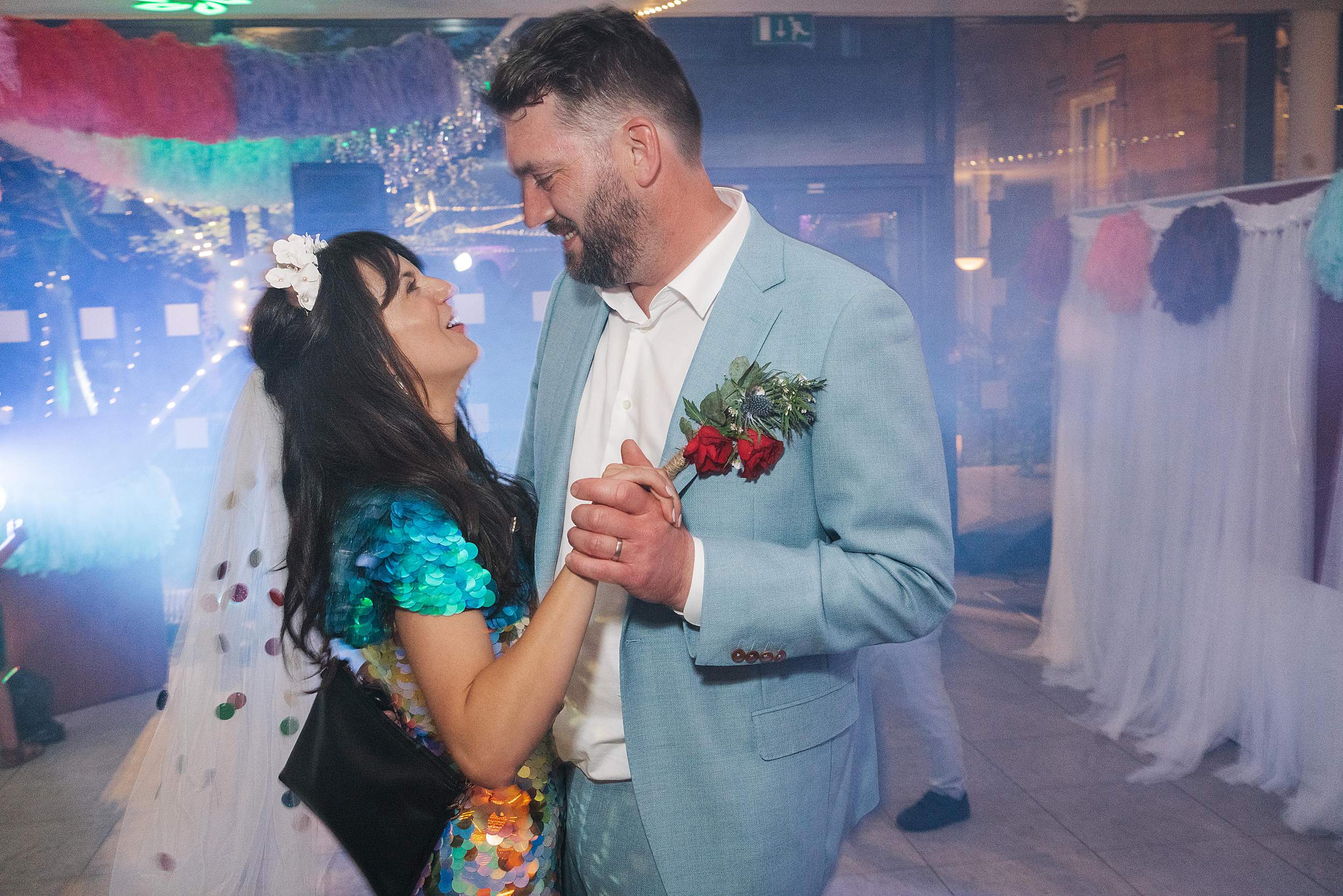 Later on, Fi changed into full party gear: a huge glittery sequinned jumpsuit and instant festival bride energy. A quick spin on the dancefloor with Tim, then Tim had his father-daughter dance, and at that point it felt right for us to step back and leave them to it.