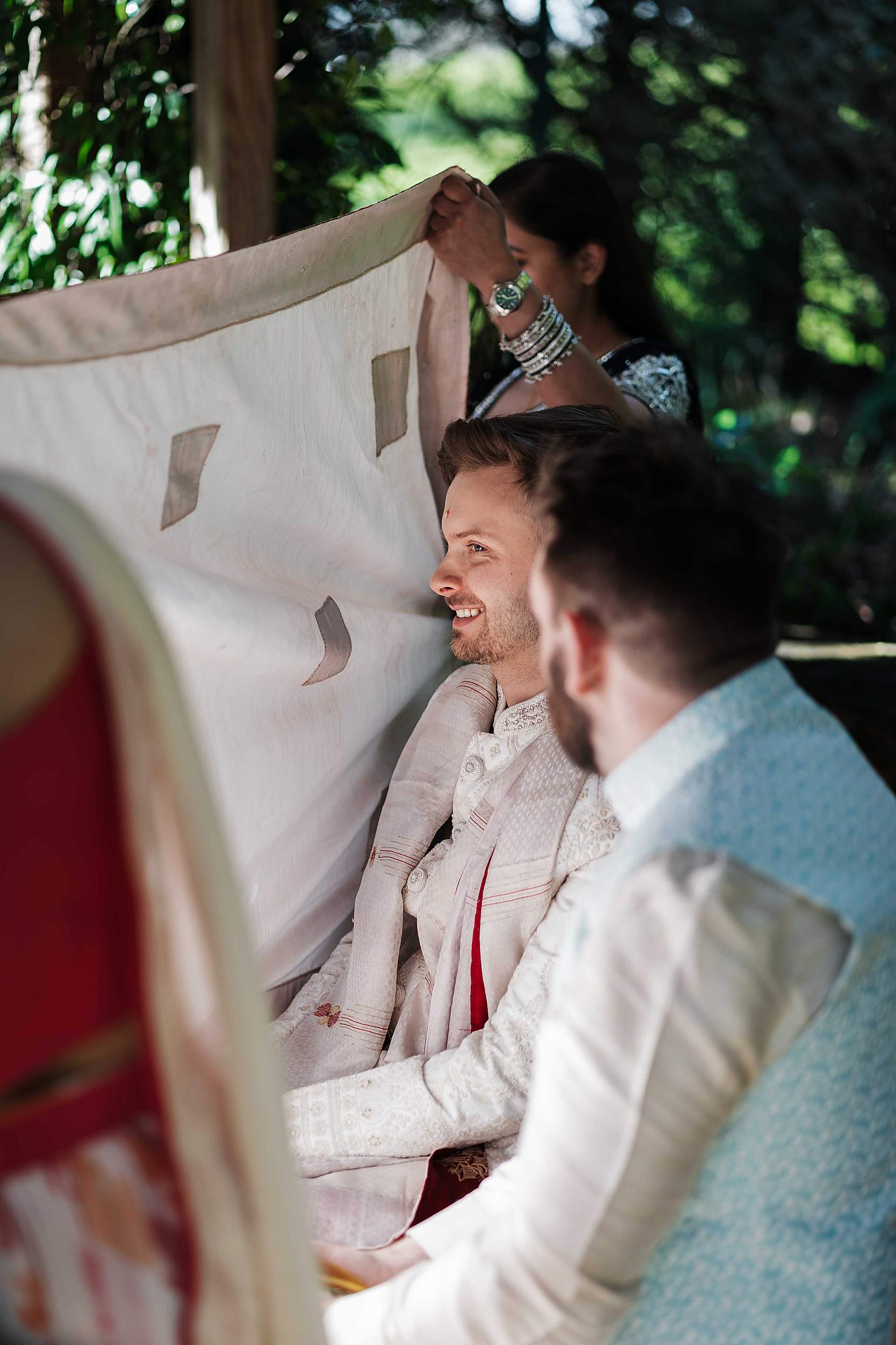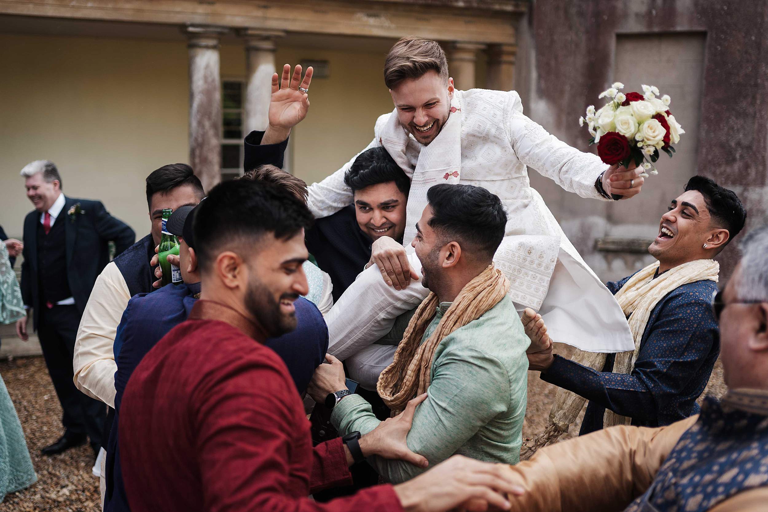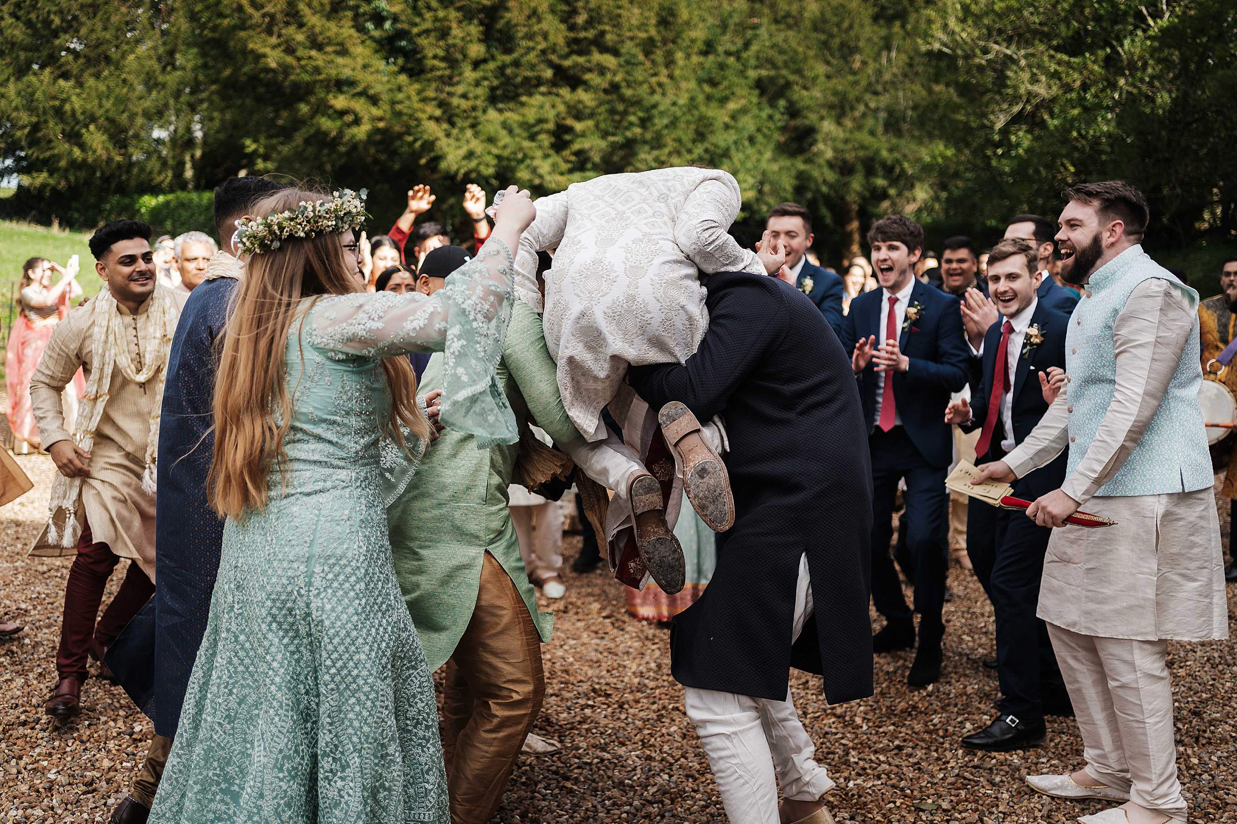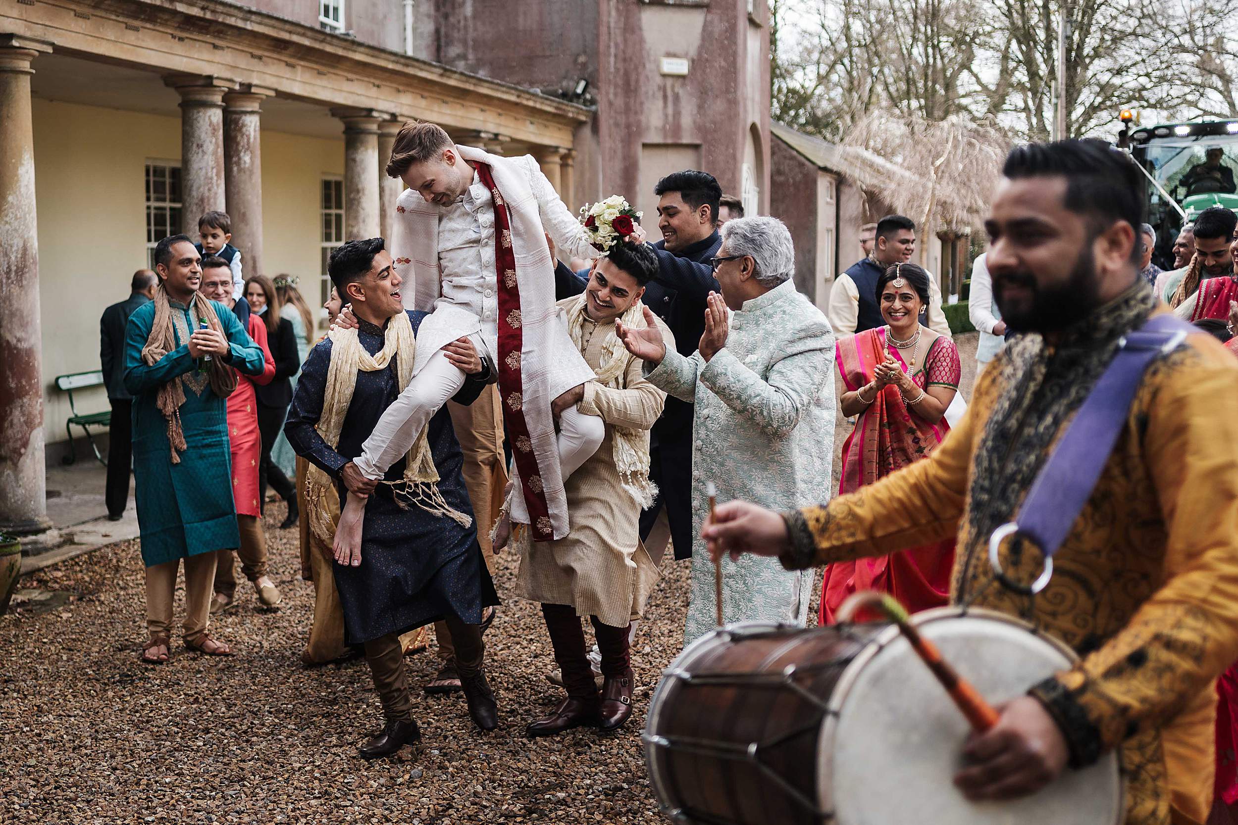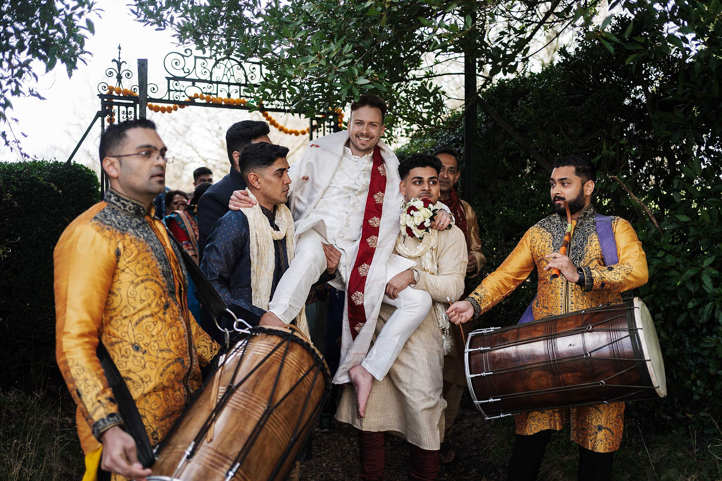 It was noisy, playful, and epic in the way only Indian wedding energy can be. Dhol drummers whipping everyone up. Guests cheering. Tom being lifted onto shoulders and carried through into the gardens to be presented to Payal’s family.