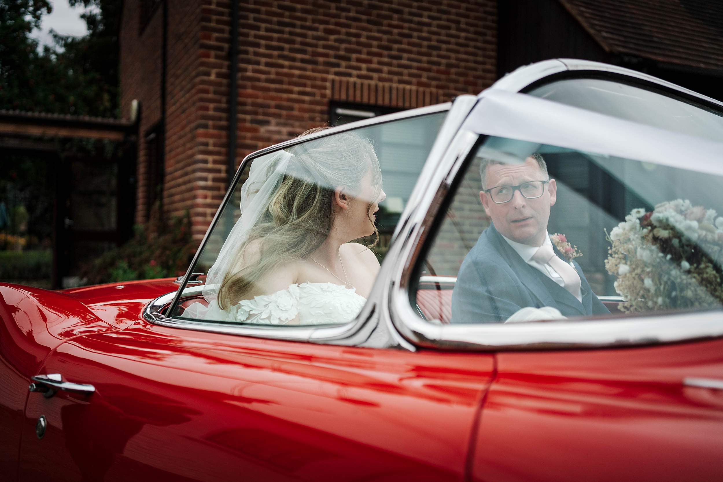 A classic American convertible, pillar-box red, concours condition – the kind of vehicle that makes people turn their heads mid-sentence. He used it to bring Sophie to the front of the venue for her entrance, and it gave the day an instant dose of cinema.